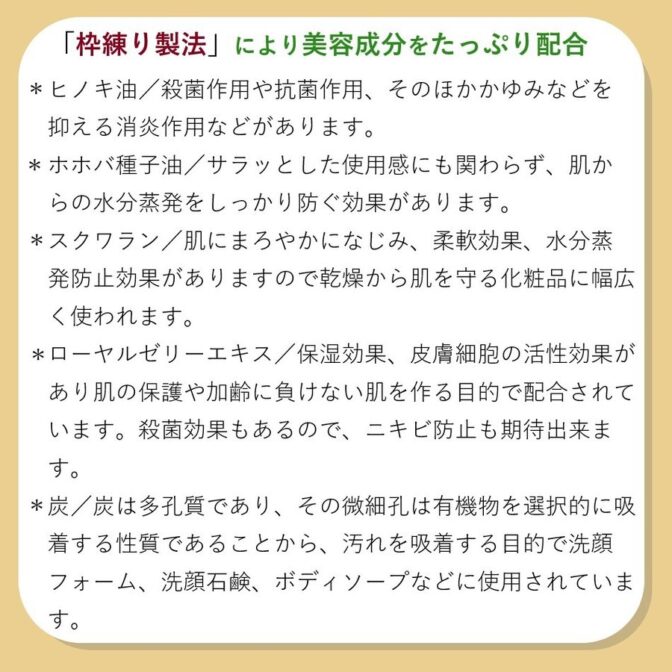 | 特徴 | 四万十ひのきオイルを使用し、美容成分をたっぷり配合することができる「枠練り製法」により、長期間かけてじっくりと丁寧に作り上げました。 心身をリラックスさせる四万十ひのきの香りが優しく広がり、まるで森林浴のようです。 弾力のあるもちもちの泡はお肌に必要のない角質や汚れを吸着し、泡切れ良く無理なく洗い流れて、清潔なお肌が保たれます。 洗顔も全身洗浄もきちんとできます。 ホホバ種子油、スクワラン、ローヤルゼリーエキスなど、たっぷりと配合した美容成分により、つっぱり感が少なくまろやかです。 肌を優しくケアします。 鉱物油、パラベン、石油系界面活性剤、合成香料、合成着色料などは一切使用していません。 *ヒノキ油/殺菌作用や抗菌作用、そのほかかゆみなどを抑える消炎作用などがあります。 *ホホバ種子油/サラッとした使用感にも関わらず、肌からの水分蒸発をしっかり防ぐ効果があります。 *スクワラン/肌にまろやかになじみ、柔軟効果、水分蒸発防止効果がありますので乾燥から肌を守る化粧品に幅広く使われます。 *ローヤルゼリーエキス/保湿効果、皮膚細胞の活性効果があり肌の保護や加齢に負けない肌を作る目的で配合されています。殺菌効果もあるので、ニキビ防止も期待出来ます。 *炭/炭は多孔質であり、その微細孔は有機物を選択的に吸着する性質であることから、汚れを吸着する目的で洗顔フォーム、洗顔石鹸、ボディソープなどに使用されています。 |