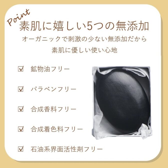 | 成分表示 | 石ケン素地、水、スクロース、グリセリン、エタノール、ソルビトール、ホホバ種子油、スクワラン、ローヤルゼリーエキス、炭、HEDTA-3Na、BG、ヒノキ油 |